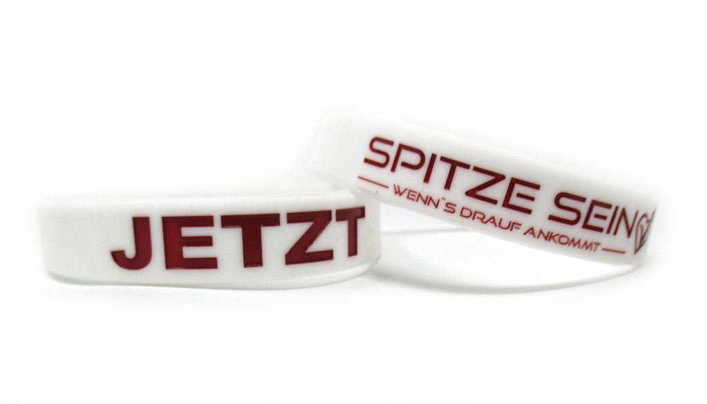 Das Silikonarmband wird exakt in Ihrer Farbe eingefärbt und mit Ihrem Wunschmotiv (Logo, Slogan) tiefgeprägt und anschließend mit der Füllfarbe aufgefüllt.